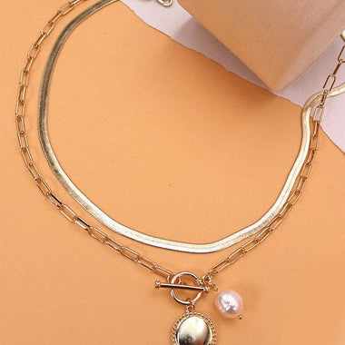 Double Layer Toggle Necklace with Pearl and Lock Charm - Gold