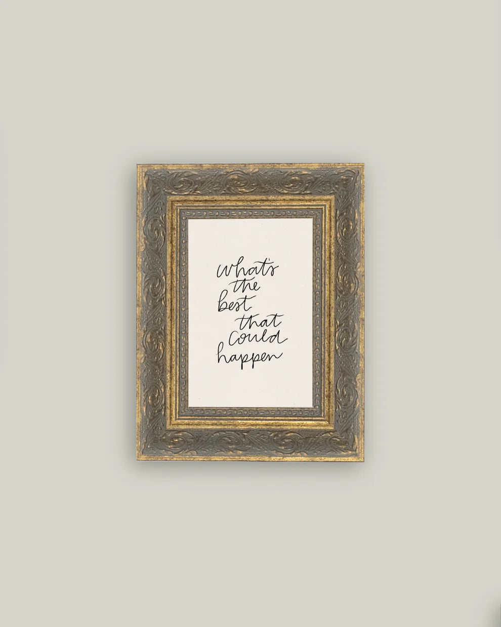 This vintage artwork is printed on raw canvas and placed in an antique frame for an authentic, timeless look. A perfect piece for layering art. "What's the best that could happen" is a phrase that encourages an optimistic outlook by focusing on the most positive possible outcomes rather than negative ones.