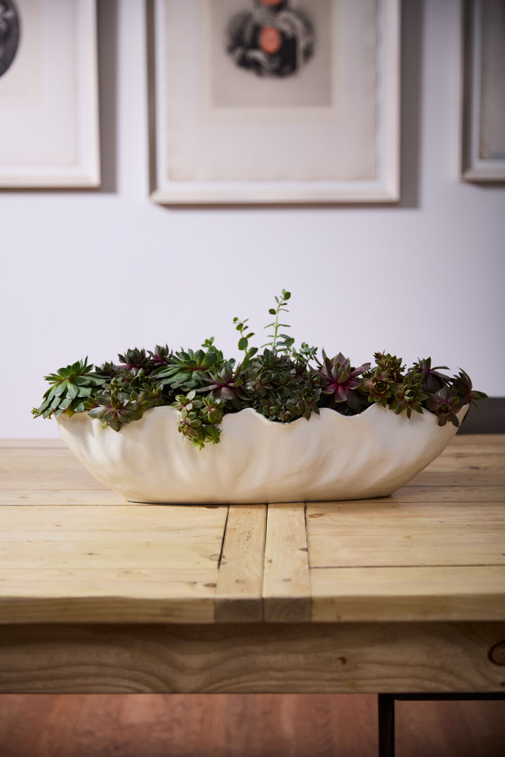 Celebrate artisanal style with the elongated wide ceramic Coastline Trough. Featuring an organic ruffled rim & a warm white reactive glaze that provides variation in the finish, this piece makes a lovely long centerpiece for floral arrangements, orchids, succulents, and other blooming plants. This elevated piece is perfect for a console, coffee table, or dining table.