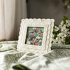 Made from finely crafted bone, this 4x4 square picture frame displays a stunning array of cream tones, varying subtly across its surface to offer a natural, organic feel. Featuring three layers of delicately scalloped edges that create a dimensional border for your photograph, this photo frame provides an elegant, vintage look that pairs well with cottage decor styles. Easel back and 1 sawtooth hanger for tabletop or hanging options.