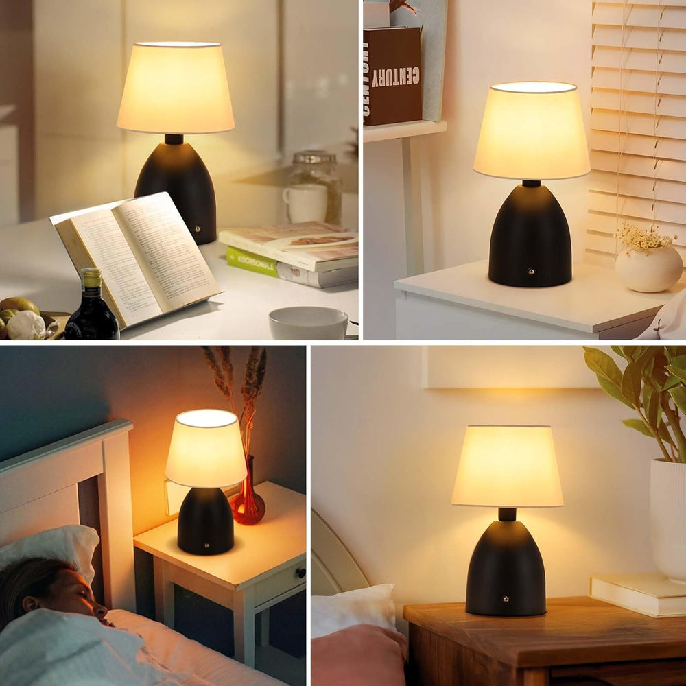 This rechargeable lamp combines elegance and practicality with its sleek, minimalist black body with a white fabric shade design that fits any decor. It offers four different dimming functions (10%, 45%, 75%, 100%) to fit your every need.