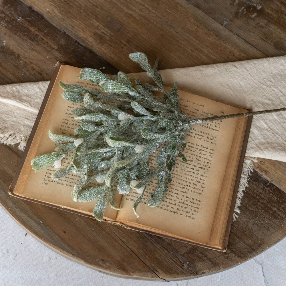 Embrace the holiday spirit with this 12" Mistletoe Pick. This Frosted "ice kissed" Mistletoe Pick is a winter floral that has faux mistletoe leaves, white berries and a dusting of glitter for an icy look. Add it to wreaths, garlands, or floral arrangements for a festive touch of winter charm.