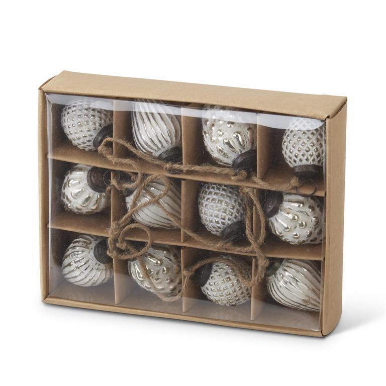 Whitewashed Mercury Glass Acorn Ornaments S/12