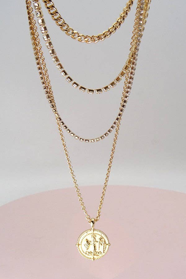 Double Rhinestone Coin Pendant Layer Necklace - Gold
