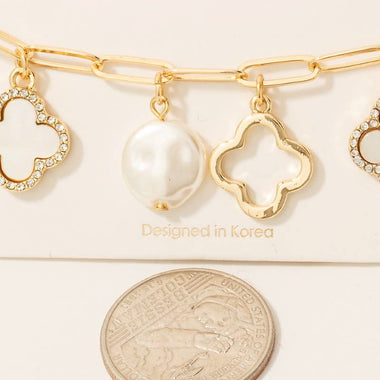 Large Pearl And Clover Charms Chain Bracelet - Gold