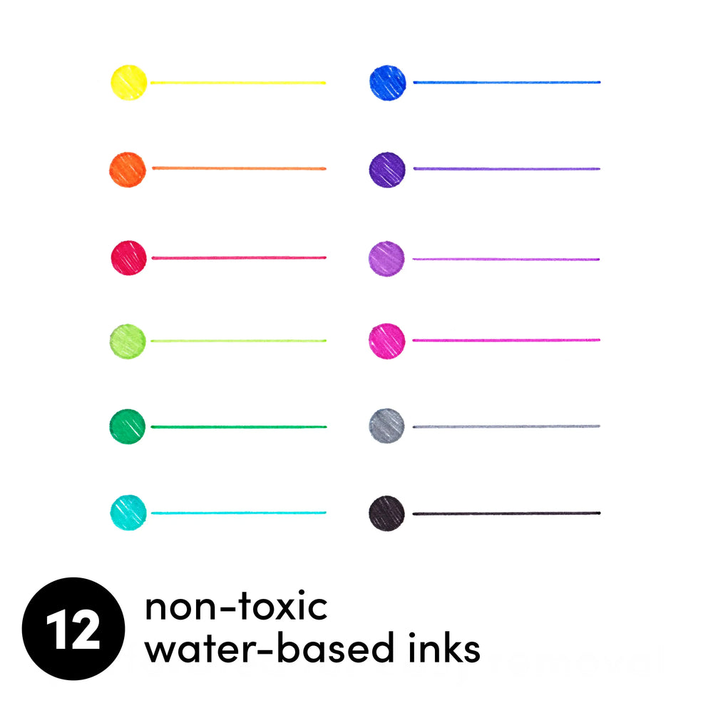 Features: Smooth 0.4mm felt tips for crisp, clean lines. 12 vibrant colors to elevate your creativity. Triangular barrel for comfy grip and no rolling. Water-based ink safe for kids and adults. Clear case keeps your pens organized and portable.