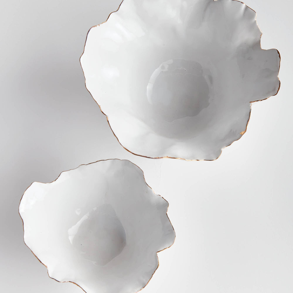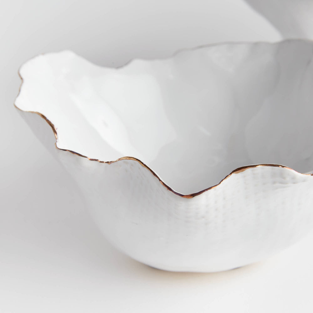 With crimped edges and natural form, this decorative bowl is a real statement-making centerpiece. The hand-brushed gold tipped edges are electroplated for shine and durability. Place atop a few art books on coffee table, or on a side table for a stunning look.
