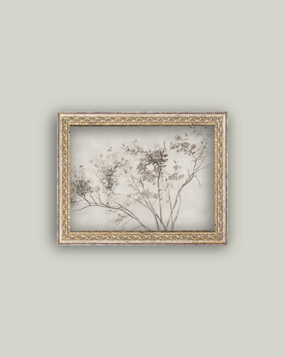 This vintage artwork is printed on raw canvas and placed in an antique frame for an authentic, timeless look.  This art features soft muted blush tones.