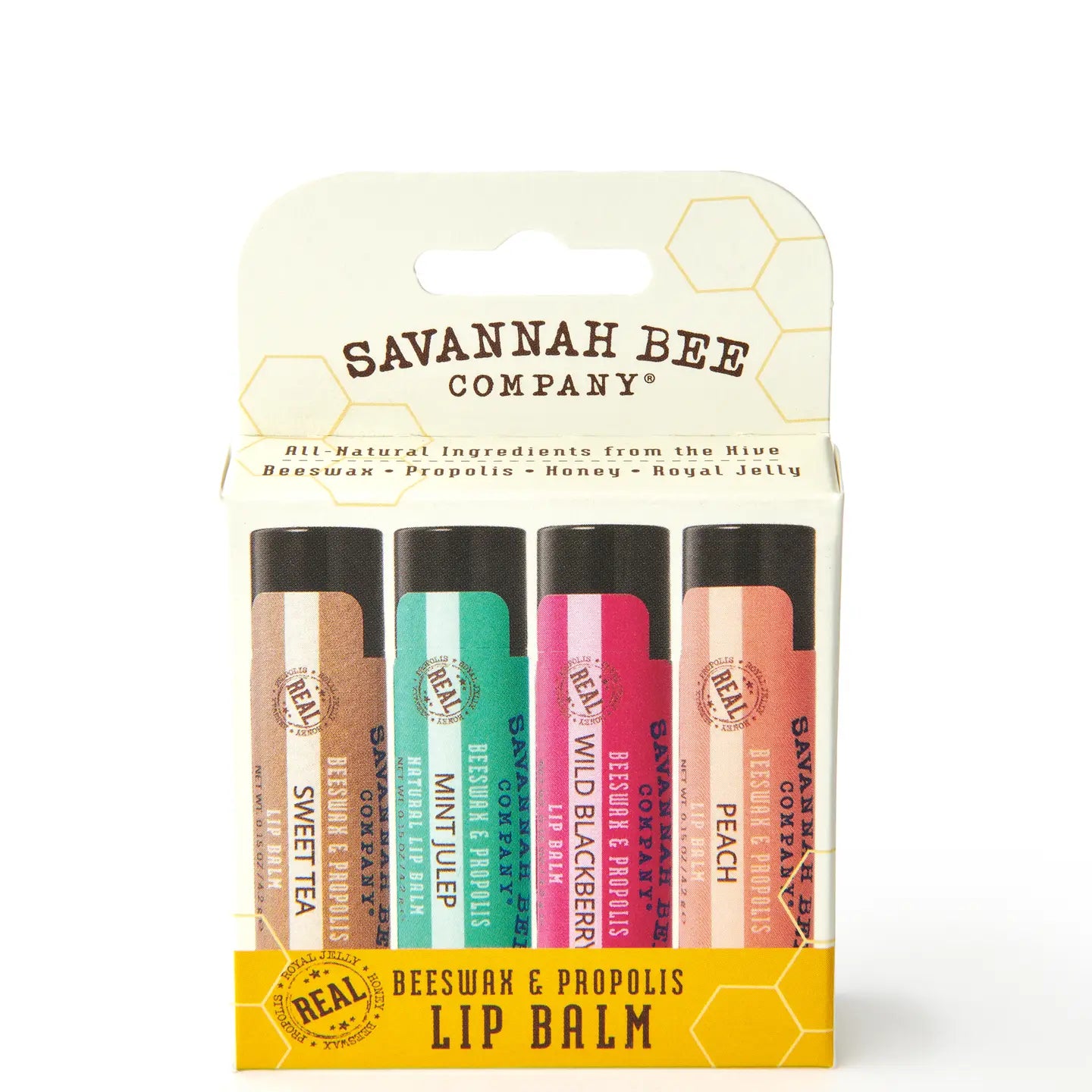 4 tubes of beeswax lip balms, including peach, wild blackberry, mint julep and tupelo honey