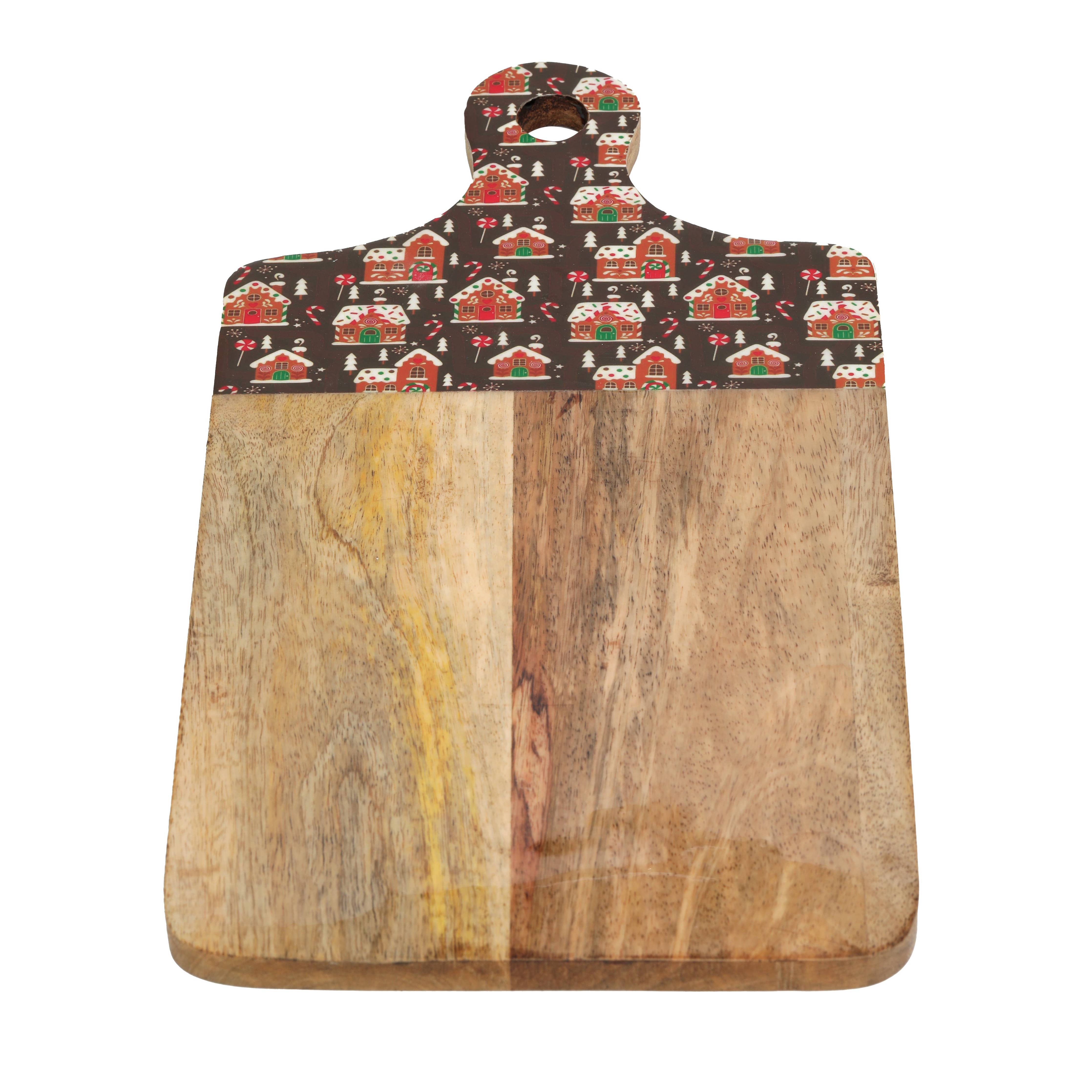 This 16.5"x9" wooden serving board features a playful resin accent of gingerbread houses, candy canes, and snowy trees along the top edge and handle. A festive choice for holiday charcuterie, desserts, or décor, it combines rustic style with seasonal charm.