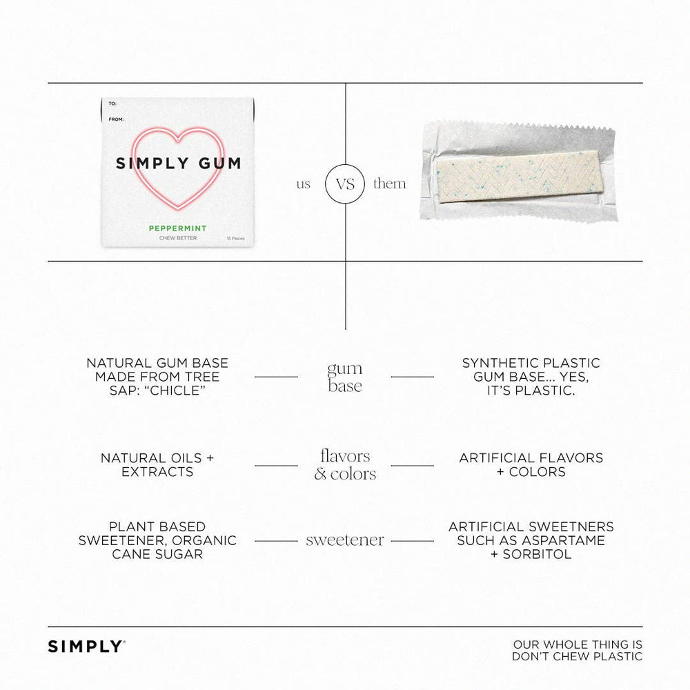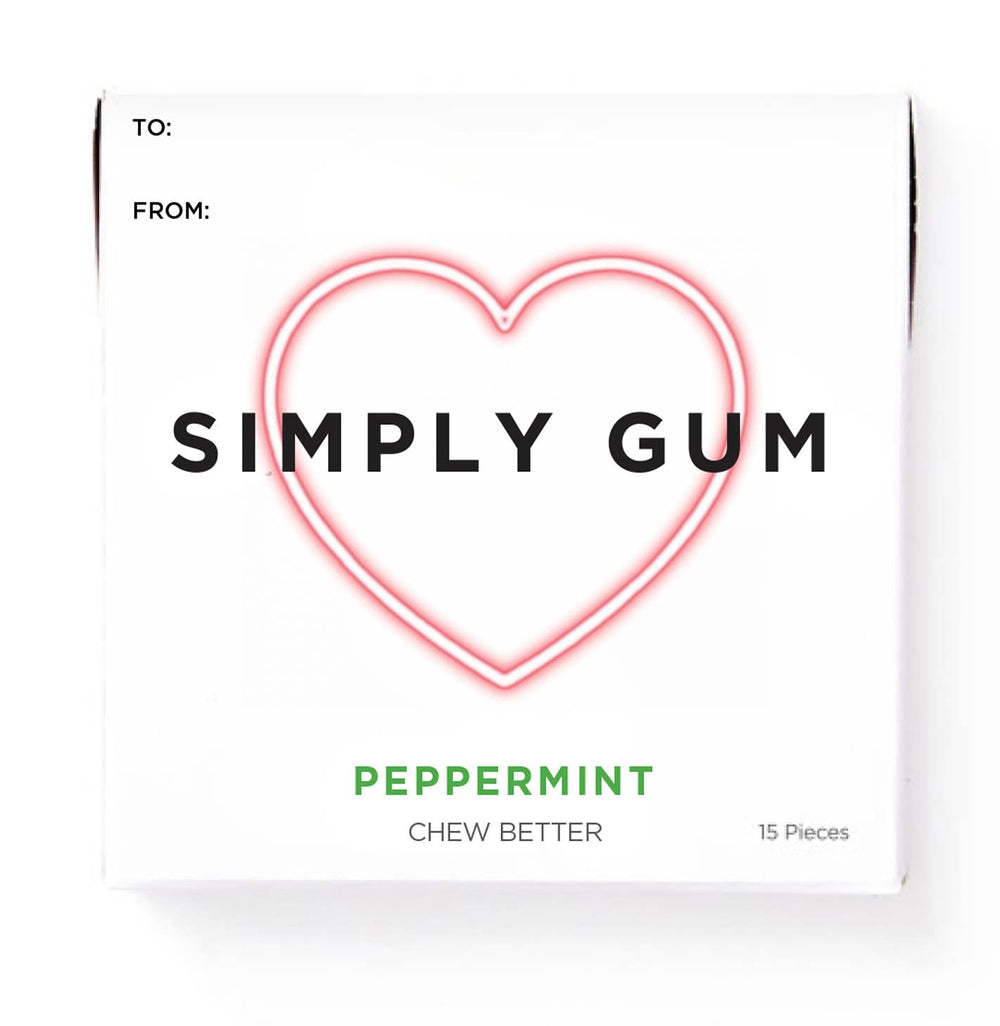 Our Peppermint Gum, featuring a heart on the box, is the perfect way to share your love with friends, family, or coworkers. Each pack of gum is made in New York with the finest ingredients sourced from around the world. We never use anything artificial - no aspartame or synthetic plastics. Why Choose Simply Gum? Plant-Based & Plastic-Free Made with chicle (tree sap) instead of synthetic gum bases. Made in the USA - Handcrafted in small batches in Brooklyn, New York. Truly Clean Ingredients No aspartame, no sorbitol, no artificial sweeteners or synthetic flavors. Just smooth, balanced taste from real plant oils. Certified Better Vegan, Non-GMO, and Kosher.