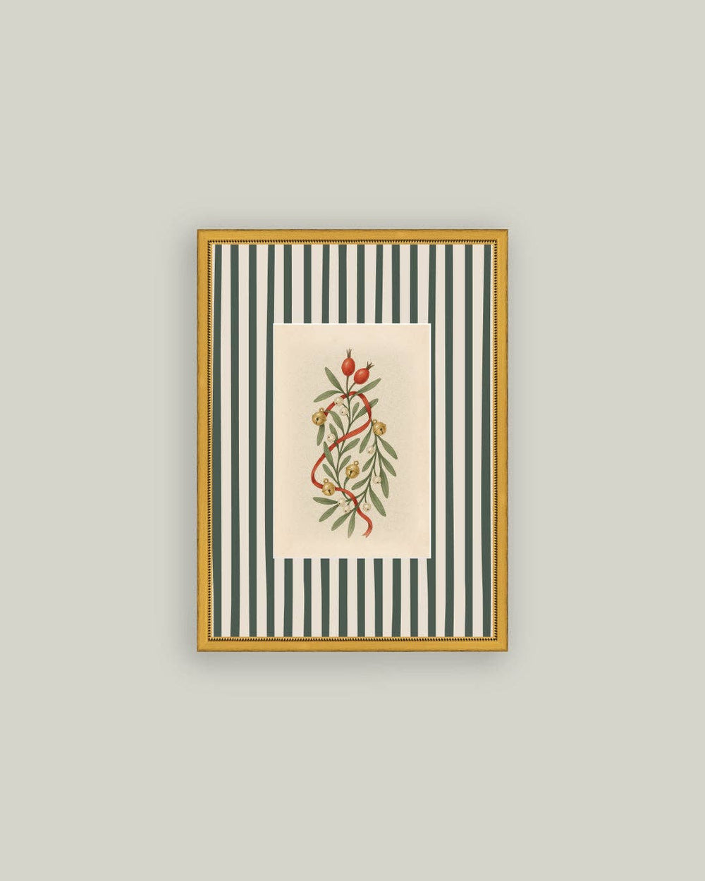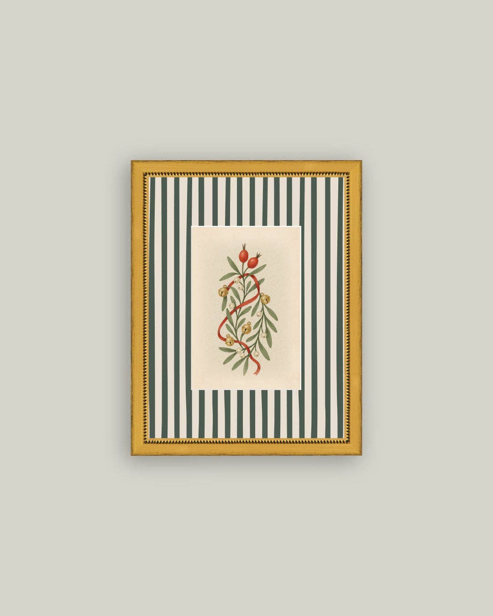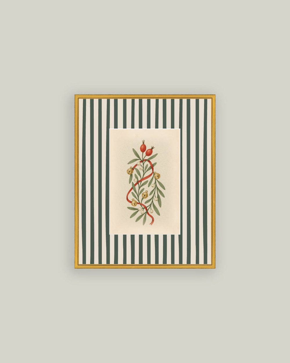 This framed art showcases a charming holly design within an elegant striped mat, adding a simple yet festive accent to your holiday décor.