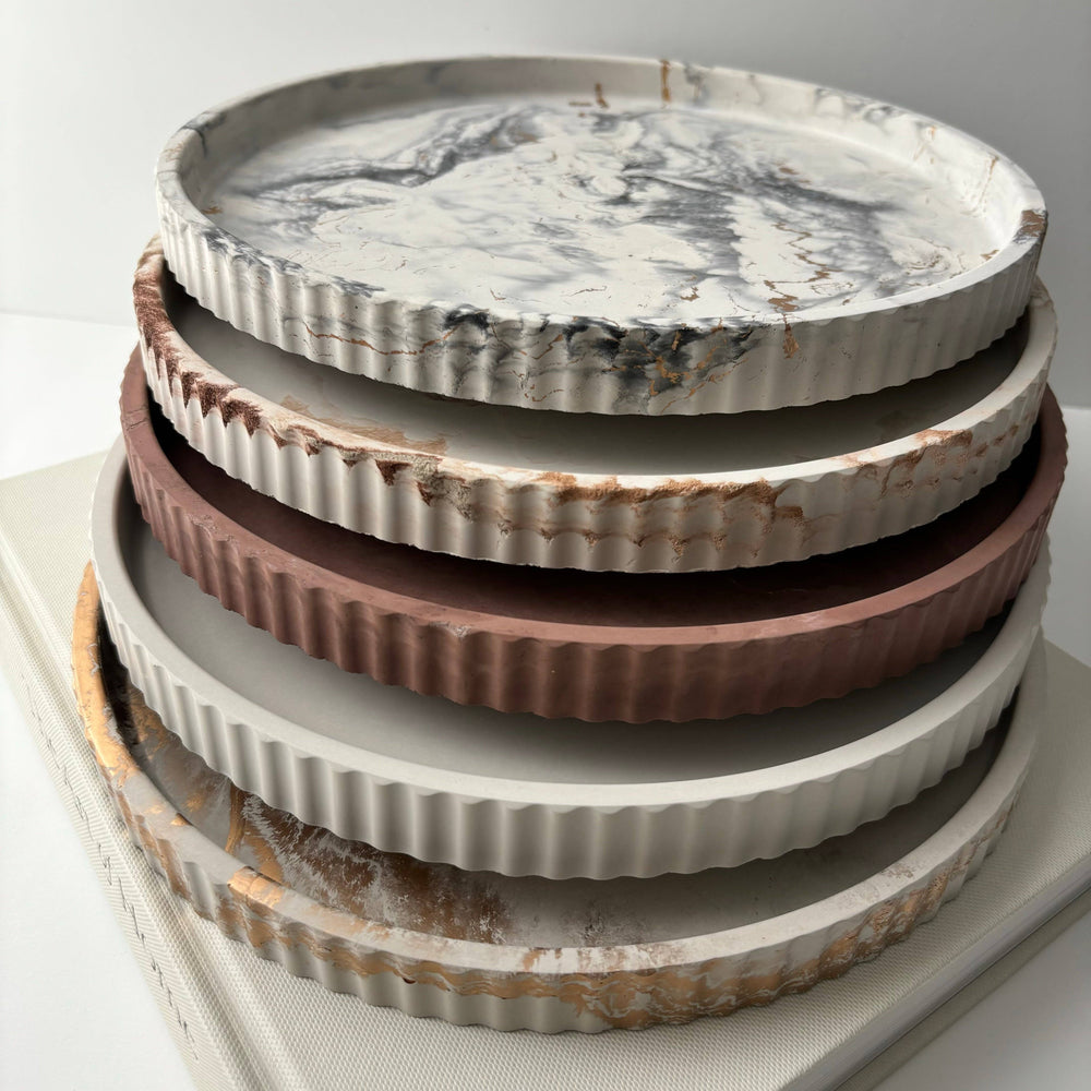 A perfect finishing touch to your decor, the Joma is a round fluted tray crafted from concrete, boasting a sleek and modern design. Its smooth surface is accented with delicate fluted edges, adding an elegant touch to any tabletop. Whether used as a centerpiece or accessory, this concrete tray adds a touch of contemporary charm to any space.