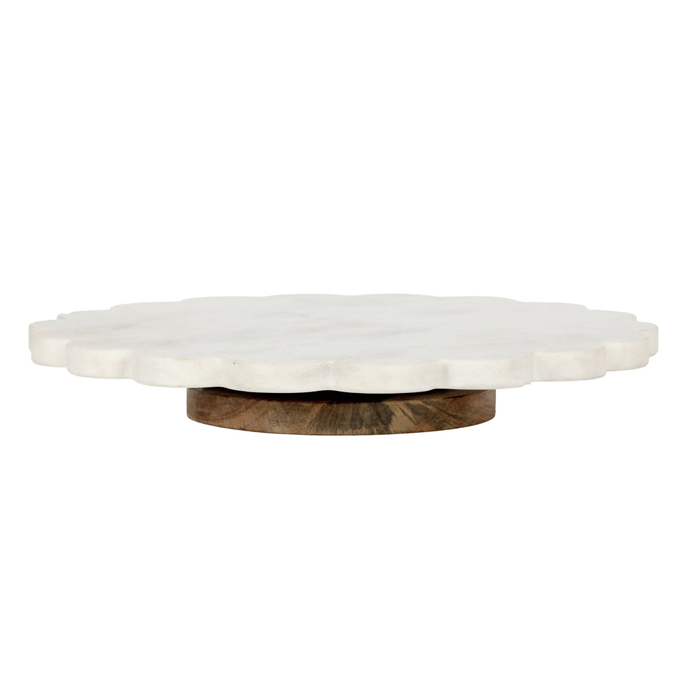 Elevate your entertaining with this 13" marble and wood Lazy Susan. Featuring a scalloped white marble top on a smooth-spinning wooden base, it blends elegance with functionality. Perfect for serving cheeses, desserts, or condiments with ease and style. A beautiful centerpiece for any table. Food safe.