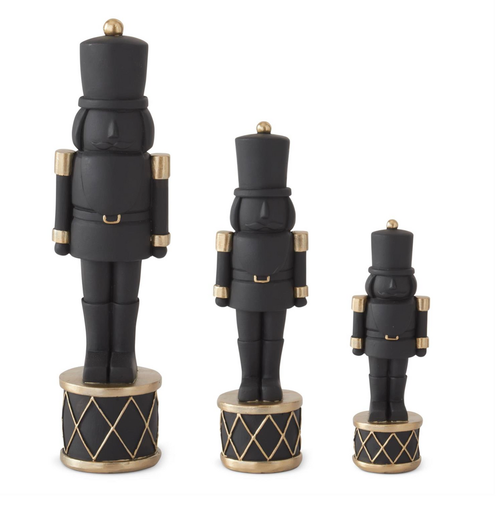 Elevate your holiday décor with the Matte Black Nutcrackers on Drums. These stunning nutcrackers redefine Christmas elegance with their bold matte black finish, complemented by luxurious gold trim. Perfect for creating a modern yet timeless festive ambiance, these decorative pieces are available in three versatile sizes: 6.5", 9", and 11.5" tall, allowing you to craft a dynamic display that commands attention.
