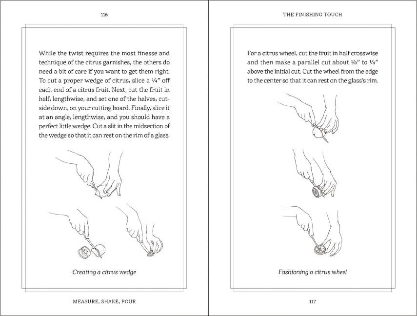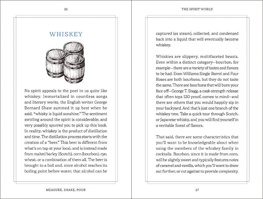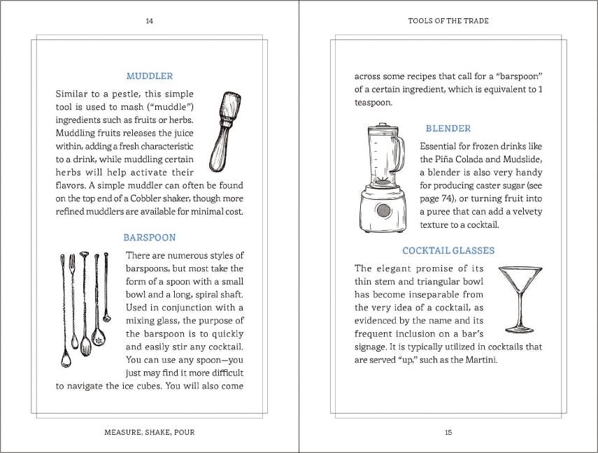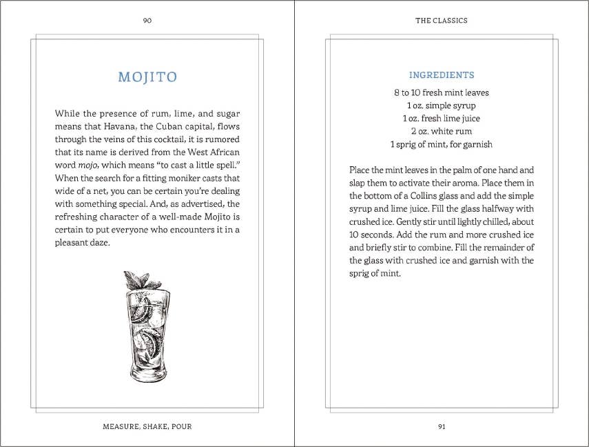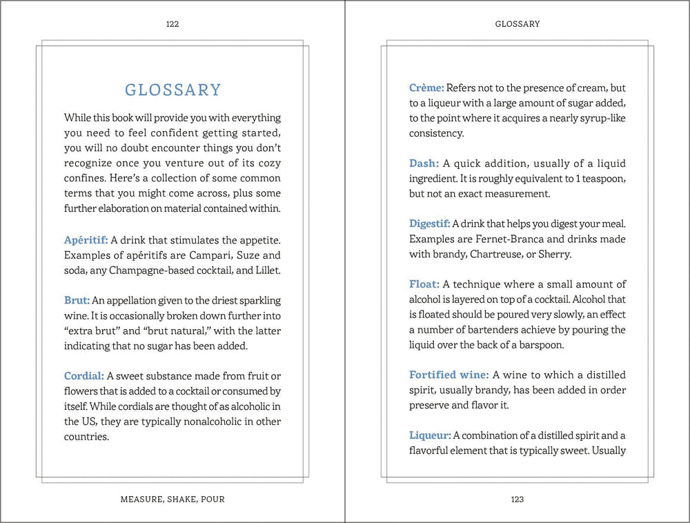 Become a mixology master with advice, recipes, and secrets from across the bar in Measure, Shake, Pour. Packed with advice on pairings, recipes, and secrets you only hear behind the bar, learn how to become a master mixologist with this book. Whether you’ve never touched an Old Fashioned glass in your life or are a spirit professional, this guide will raise the bar on your drink game, guaranteed. Inside this recipe guidebook, you will discover how to make classic favorites such as: Old Fashioned Martini Mojito Sangria Margarita Manhattan Featuring everything you need to become a bartending pro, from general terms and drinks to advanced recipes, techniques, and finishing touches, Measure, Shake, Pour is the ideal guide to all things bartending and is the perfect size to hide in your back pocket. After all, a good bartender never reveals their secrets for free. Hardcover book.