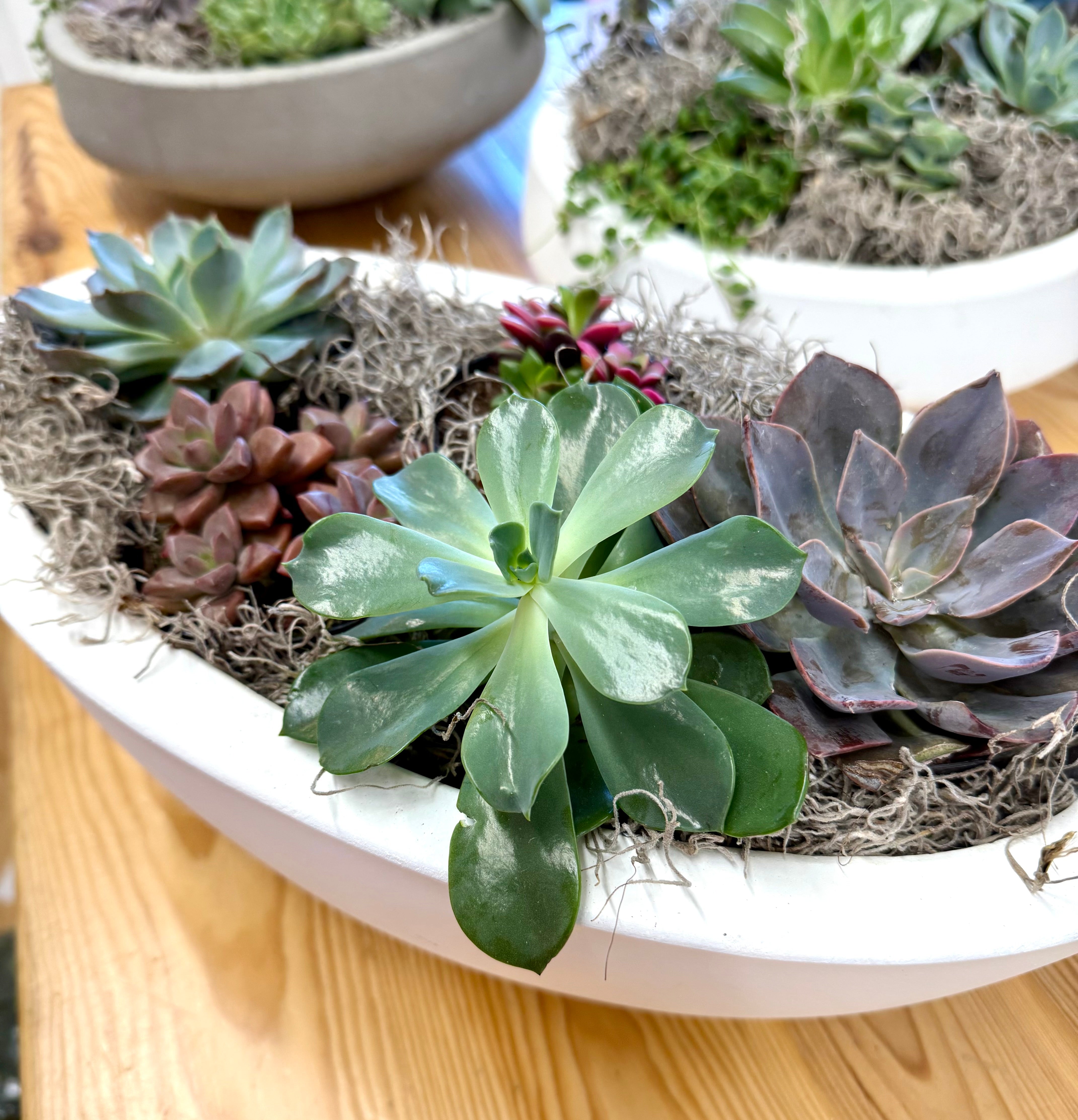 This curated succulent garden blends a range of rosette shapes and textures for a fresh, contemporary look. Elevate and freshen your space instantly with this succulent arrangement that features a white oval bowl and five succulents.