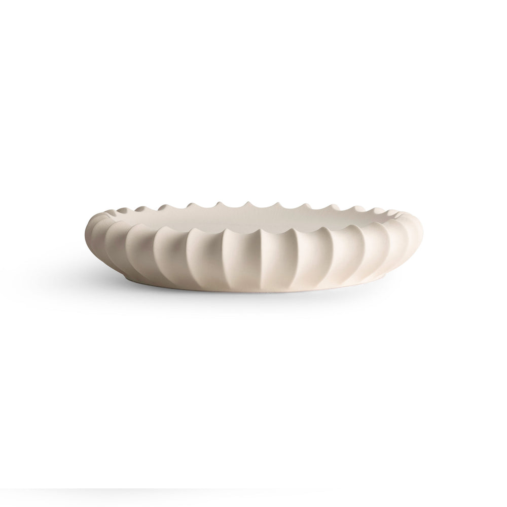 The versatile Phoebe Bowl features a ridged exterior and a scalloped rim, all shaped from thick ceramic in a matte off-white finish. This low and shallow vessel would make a gorgeous base for a decorative display, or it could serve a functional life as a catch-all for small objects at an entryway or vanity table.